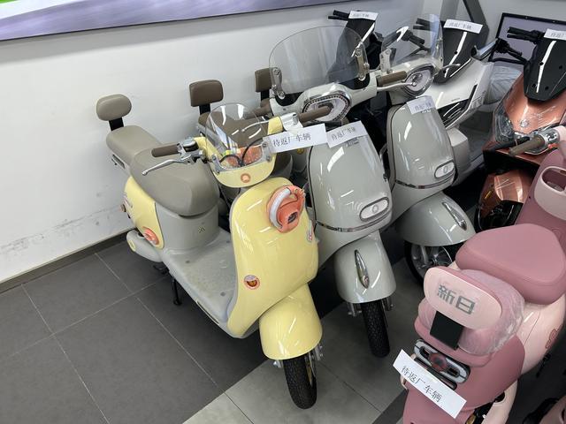 在吕营大街的新日电动车店,门店的一角还摆放着不少老国标电动车,上边贴着“待返厂车辆”的贴纸。对此店员表示,这些车只是在这里暂放,门店已经不对外售卖了。“正在售卖的车都有电动车产品许可证,上面会写清电动车符合新国标要求。”